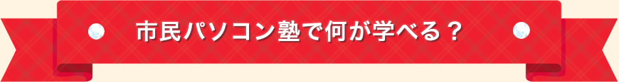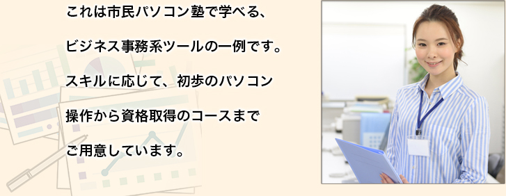 市民パソコン塾は学生から主婦・社会人、ご年配の方まで幅広く受講できます。豊富な講座があるので、じっくり長く受講することもできます。お仕事に役立つパソコンのスキルアップを一緒に目指しましょう!